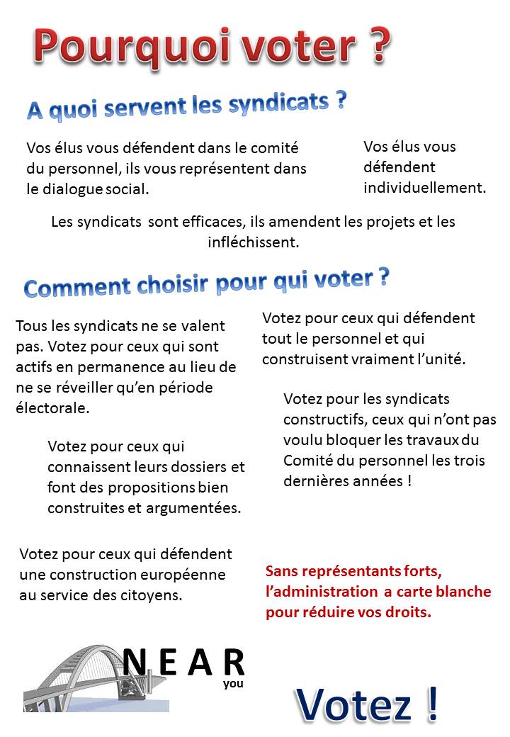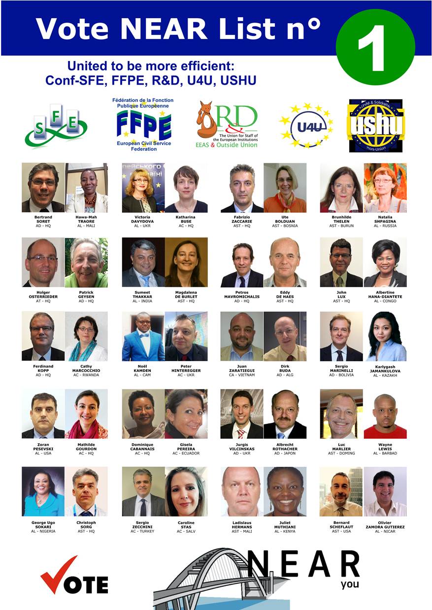 Please vote for the whole NEAR you list. Only by voting for the whole list you will allow our team to keep the maximum coherence and work for you efficiently ! This common list equitably reflects the composition of the EEAS. These experienced candidates commit themselves for the long run. We are a team that is just like you, that listens to you, understands you and that will firmly represent and support you. We ask for your trust and support because our sole commitment is to the interests of all staff. Our Team