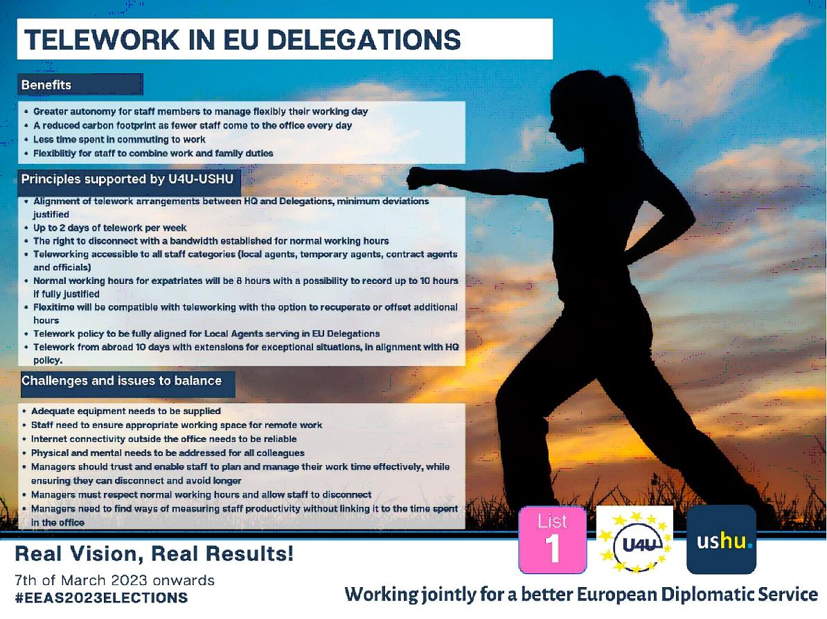 We will oppose any attempt to impose a deterioration of our working environment such as open spaces, hot desks etc. and we will support practices that ease staff working conditions such as teleworking in all delegations whenever technically feasible.